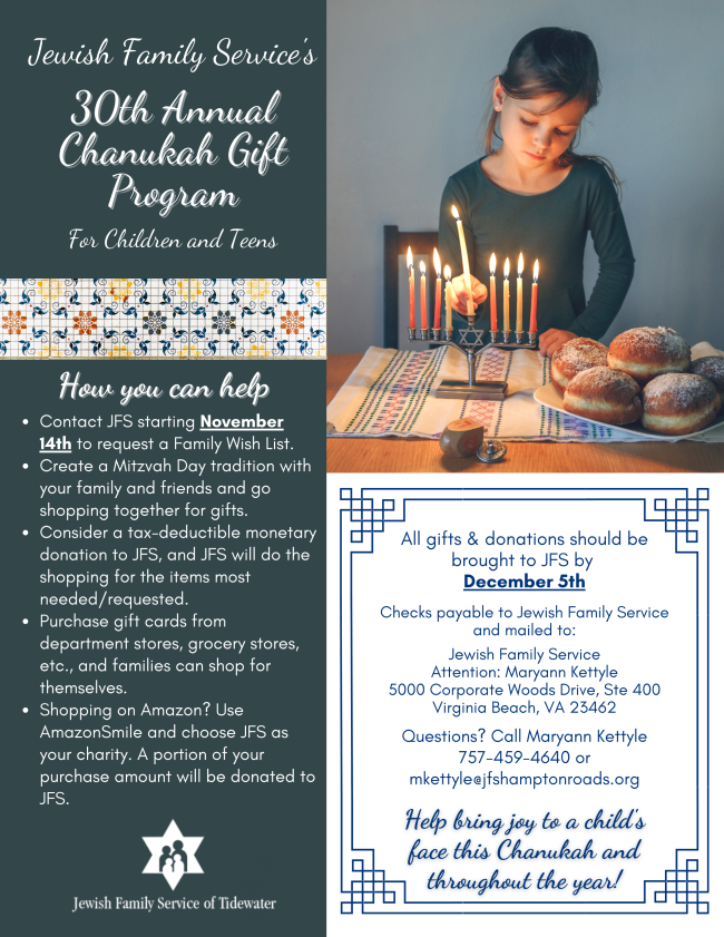 Although JFS knows that Chanukah may or may not be a time where gifts are exchanged in every family, JFS hopes that students and their families will want to support this annual gift drive and reach out to those in need. Please call Debbie Mayer or Maryann Kettyle at JFS with any questions: (757) 459-4640.