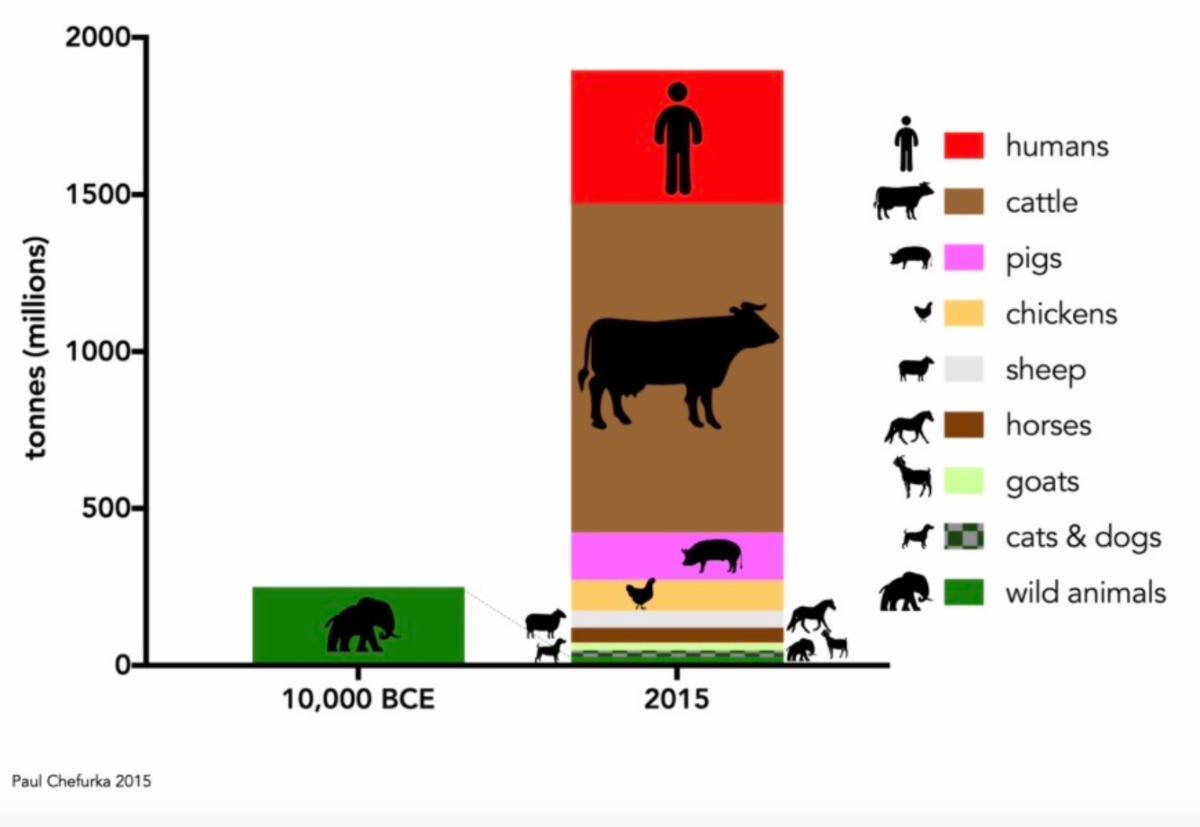 Check out the chart below, Just we humans, along with our cows, pigs and chickens now account for over five times more than the world's TOTAL animal biomass 12,000 years ago.