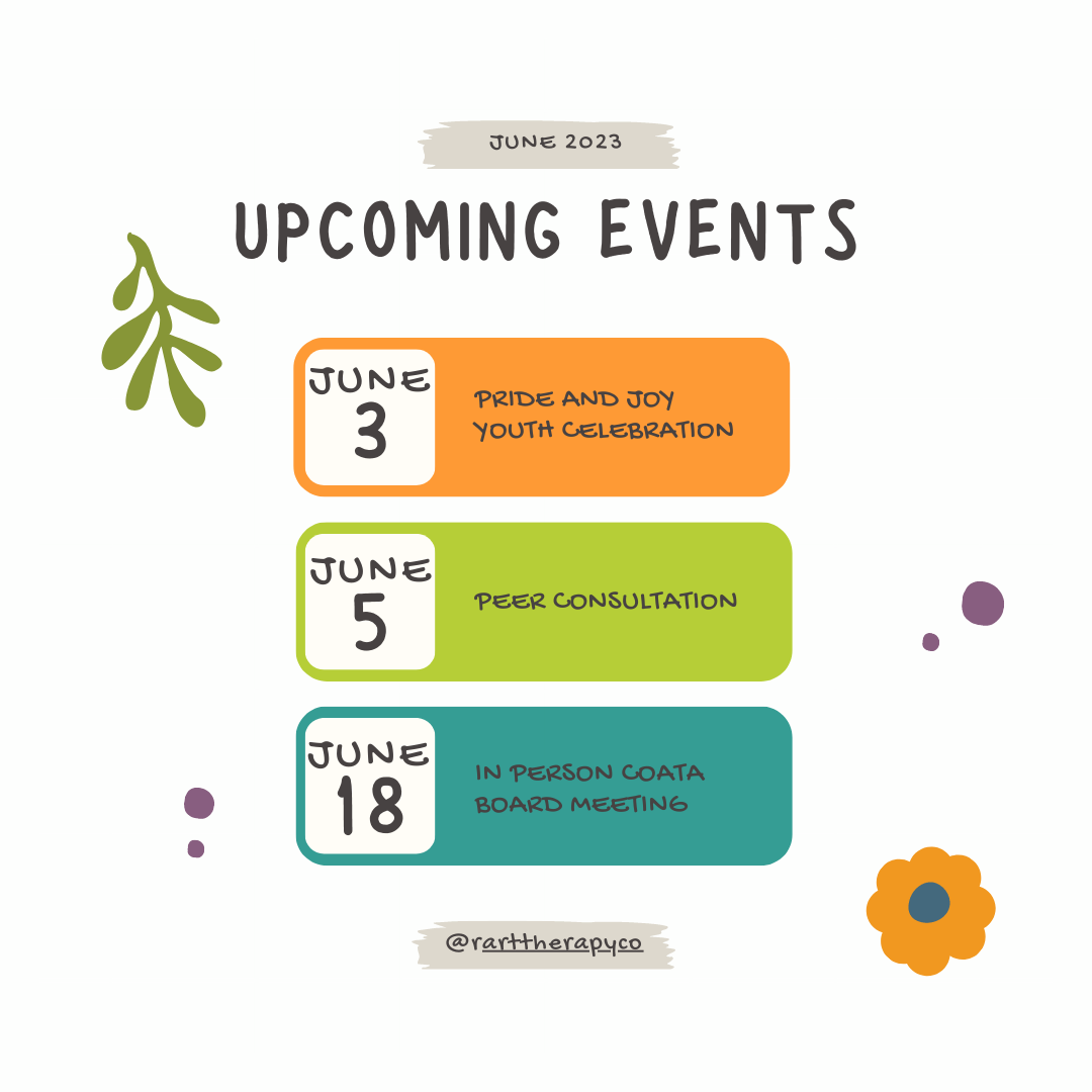 In April, Nicole Nepote, Government Affairs Chair, started the Government Affairs Committee, dedicated to developing a direction for our art therapy advocacy efforts in 2023-2024. In May, we organized the Art Therapy Conference committee, aiming to provide an impactful conference for the purpose of advancing the field of art therapy in Colorado in 2023.