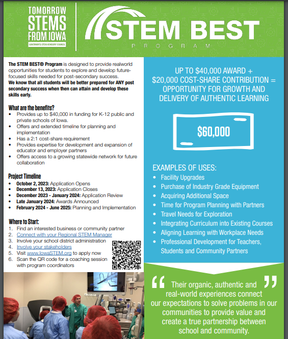 The application opens on October 2, 2023. More Information is available at iowastem.org/stembest.
