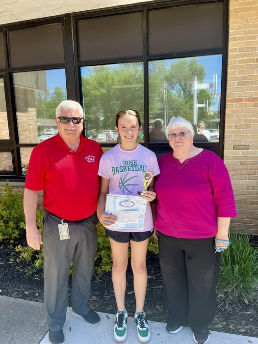 Congratulations to 7th grader, Stella Waller, on her third place finish in the Elks State Writing Contest! Pictured with Stella are Roger Lampe of the Elks Lodge and Language Arts teacher, Mrs. Linda Kirkendall. Stella is the daughter of Doug and Erin Waller.