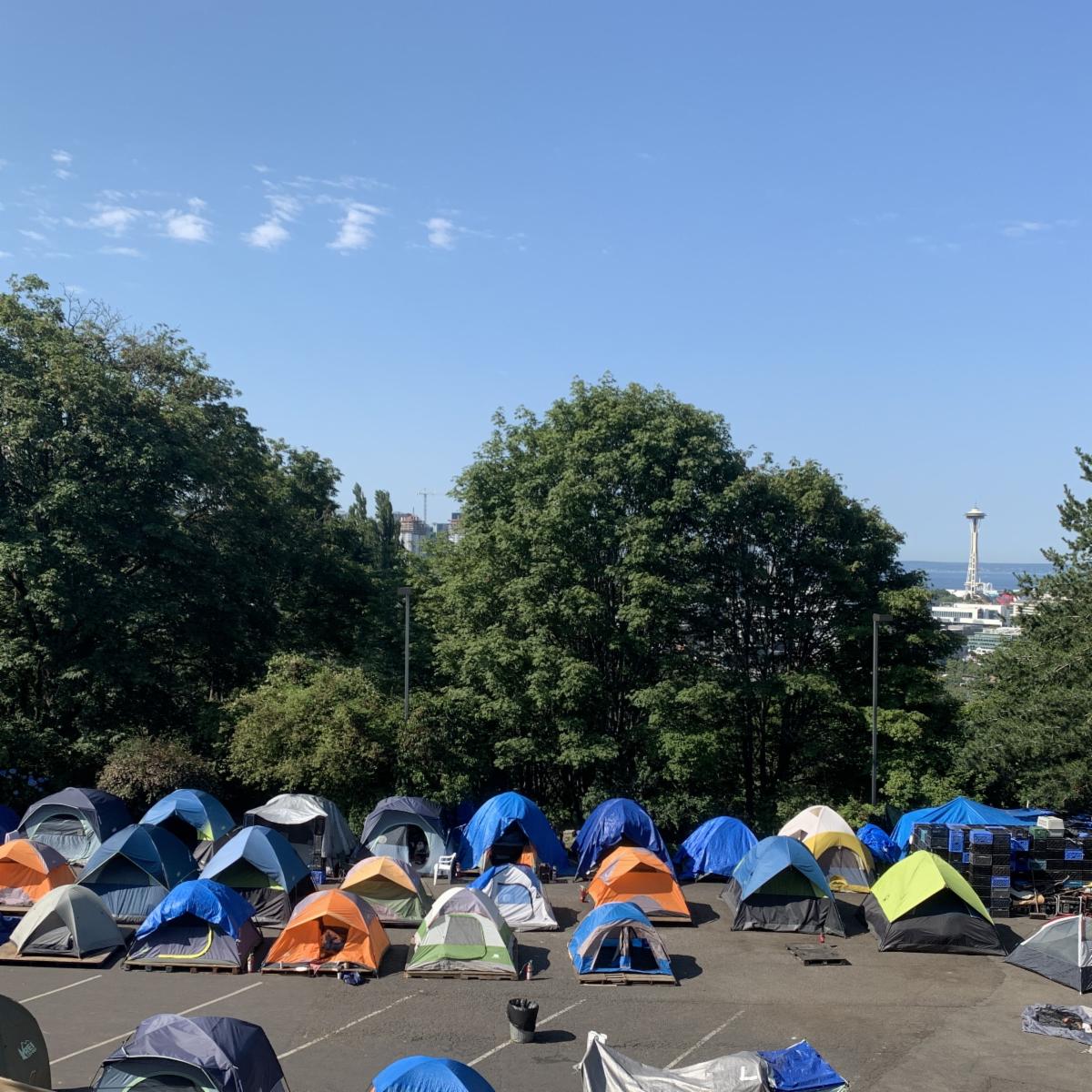 Tent City 3 returned to the lower parking lot of the cathedral, and remains in residence through early September. These neighbors are a familiar presence to longtime members of the Saint Mark's community, having been in residence three months each year from 2001 through 2013, and then again every summer since 2020. Those newer to the community may be interested to learn that Tent City 3, or TC3, exists under an agreement with the city that allows it to remain on the property of institutions like churches and universities for 12 weeks at a time. The agreement also limits the capacity of the encampment to 100 people, although it currently somewhat smaller. Drugs and alcohol are strictly forbidden, and their use are grounds for expulsion. They are almost entirely self-contained, although the cathedral provides water and electricity during their stay. Residents provide service to the cathedral during their stay, including cleaning the campus and walking the grounds at night.