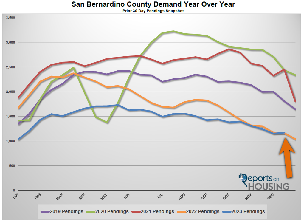 Homeowners continue to “kick back” in their homes, unwilling to move due to their current underlying, locked-in, low fixed-rate mortgage. For November, 1,633 new sellers entered the market in San Bernardino County, 844 fewer than the 3-year average before COVID (2017 to 2019), 34% less. The kick back trend deepened in the second half of 2022.