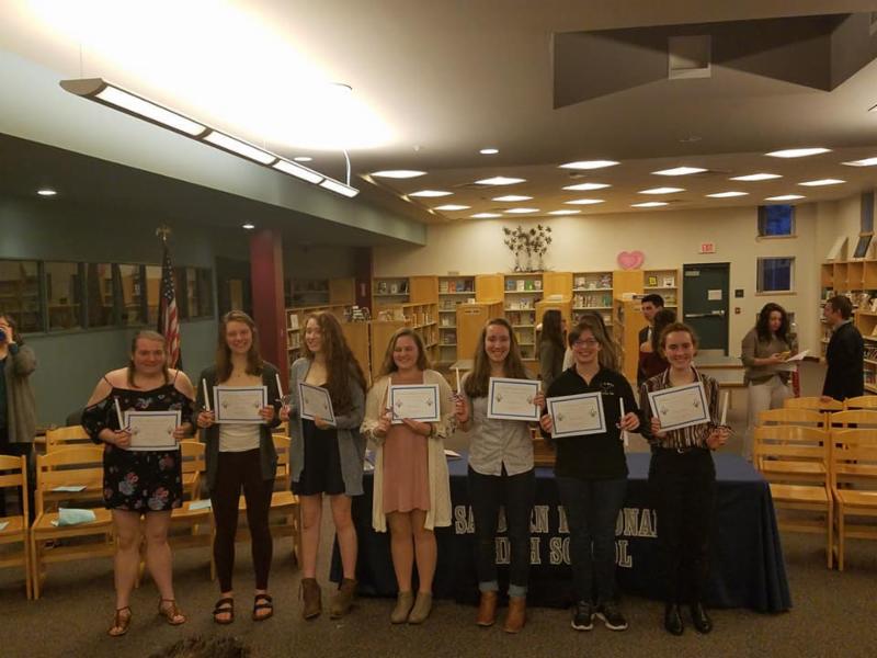 , the current members of the National Honor Society inducted 12 new members from the class of 2019. The ceremony was emceed by Chapter President, Lauren Lanseigne. That evening, members, new inductees, and attendants of the ceremony heard 4 honorary guests speak on the four pillars of the National Honor Society: Library Media Specialist, Mr. Giuliucci spoke on Scholarship, Family and Consumer Science Teacher and Advisor for the Student Council, Mrs. Price spoke on Leadership, retired Science teacher and Navy Veteran, Mr. Smith spoke on Service, and Guidance Counselor, Mrs. McCarthy spoke on Character. The evening continued with student speakers: Michelle Collette, Max Hayden, Eliza Johnson, and Zach Thomas. Pictured below are the 12 new members of the National Honor Society upon completion of the induction ceremony, from the left: Samantha Foley, Olivia Williams, Bridget Abney, Marissa Mullen, Lauren Anderson, Emma Donigian, Molly Breslin, Jenna Gluck, Samantha Keeley, Olivia Boucher, Sophia Boucher, and Lucas Pitkin. Congratulations!