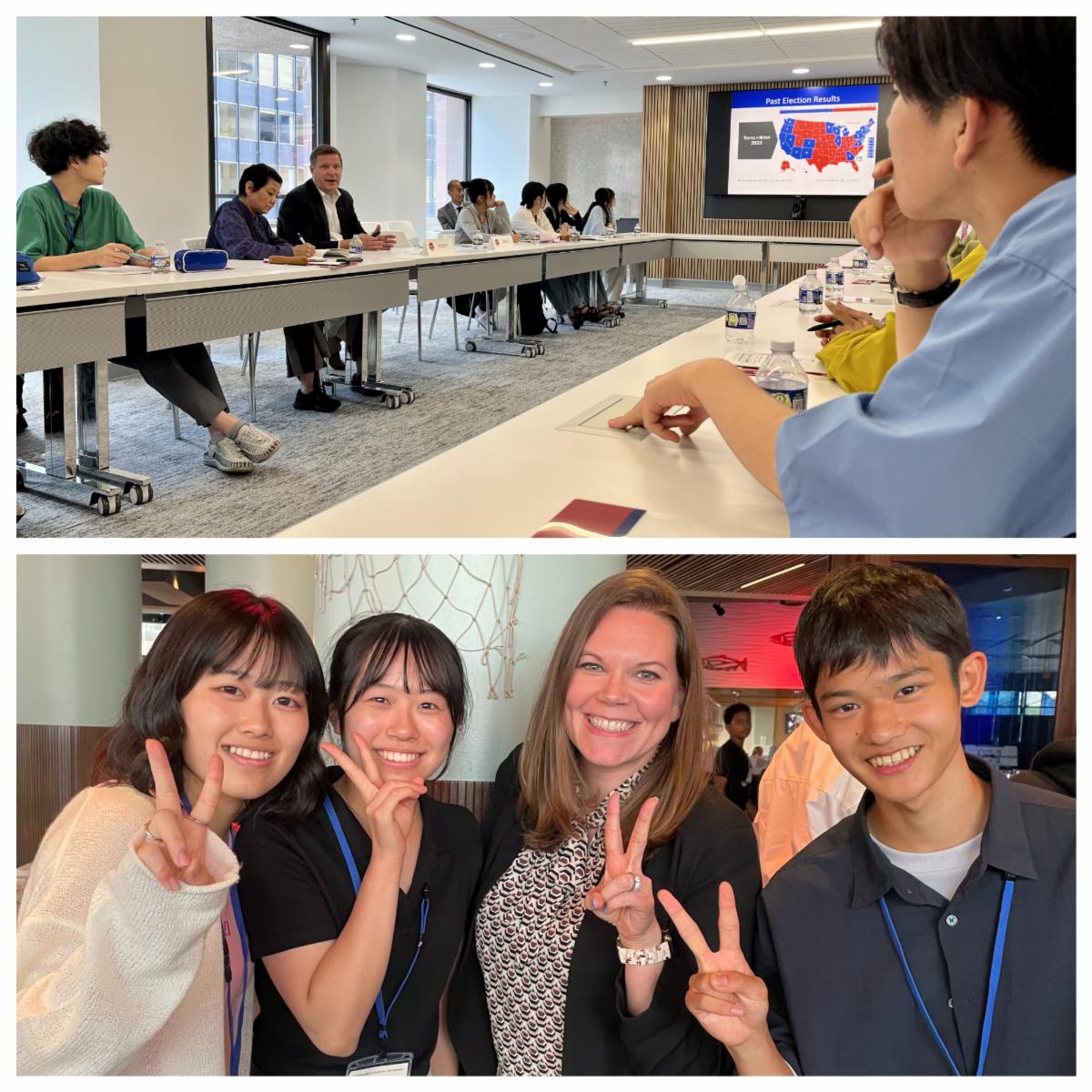 Top Photo: Mr. James Schoff (center, left-hand side) with Shinano-Mainichi Newspaper exchange students at Sasakawa USA's conference venue