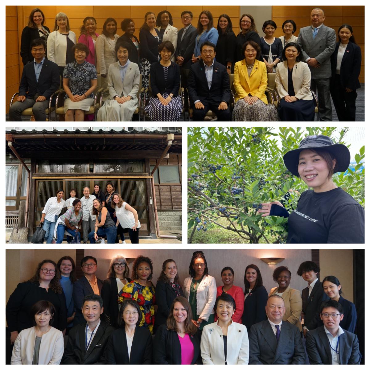 Middle photo (right-hand side): SEED delegates met with Ms. Miyuki Hira, owner of Hiramiyuki Farm, and visited her blueberry farm in Noto which was impacted by the Noto earthquake in January.