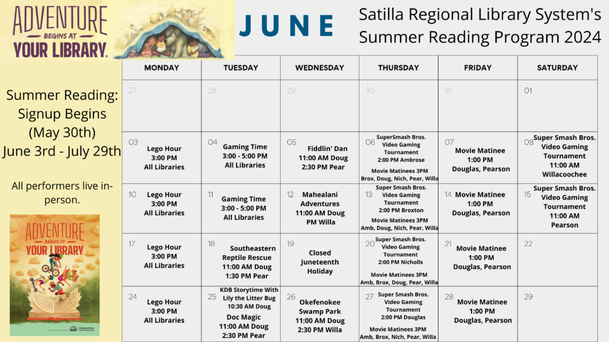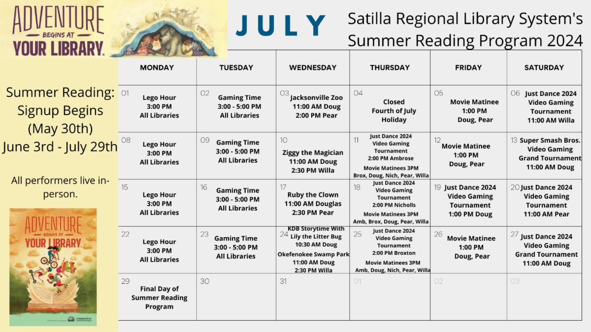 We have an exciting summer of programs for you. We have our usual performers coming on Wednesdays and two Tuesdays in-person. Signup begins on May 30th and the dates for Summer Reading are June 3rd through July 29th. Come and enjoy the Jacksonville Zoo, Okefenokee Swamp Park, Fiddlin’ Dan, Ruby the Clown, Southeastern Reptile Rescue, Mahealani Adventures, Ziggy the Magician, and Doc Magic.