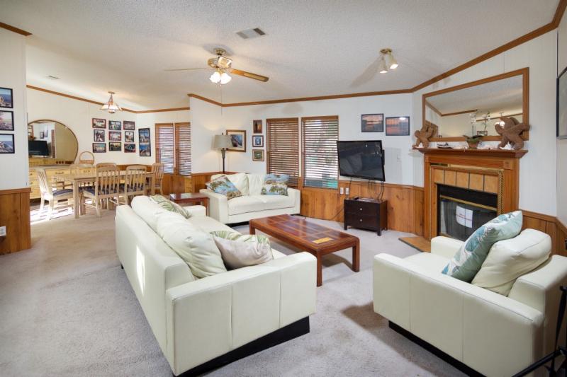 Our largest unit the, Scallywag Shack, is 6 Bedrooms and 3 1/2 baths. Granite counter tops, ceramic tile flooring, 4 bedrooms 2 bath downstairs with outside hot water shower, 1/2 bath in the laundry. Upstairs has 2 bedrooms and 1 bathroom, full kitchen and living area and a large covered and screened deck. Sleeps maximum of 15. Great for groups, meetings or events! Click here for more details.