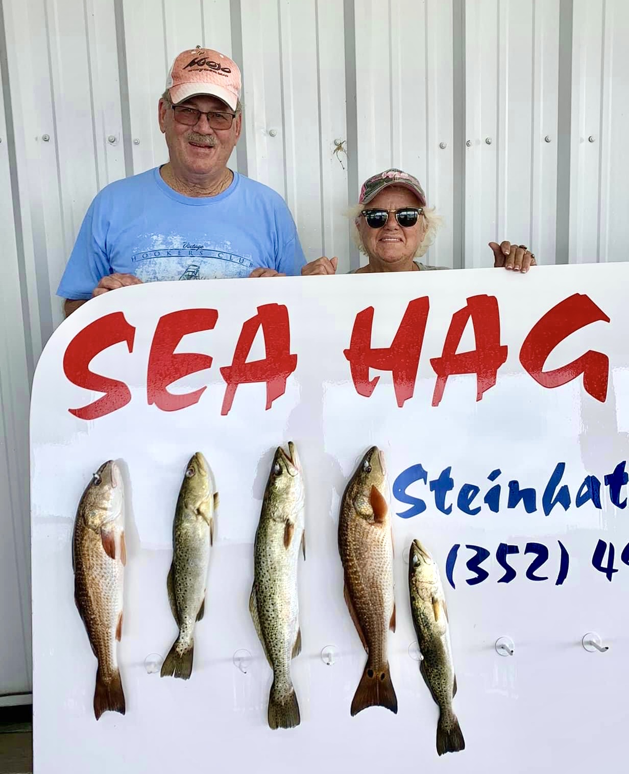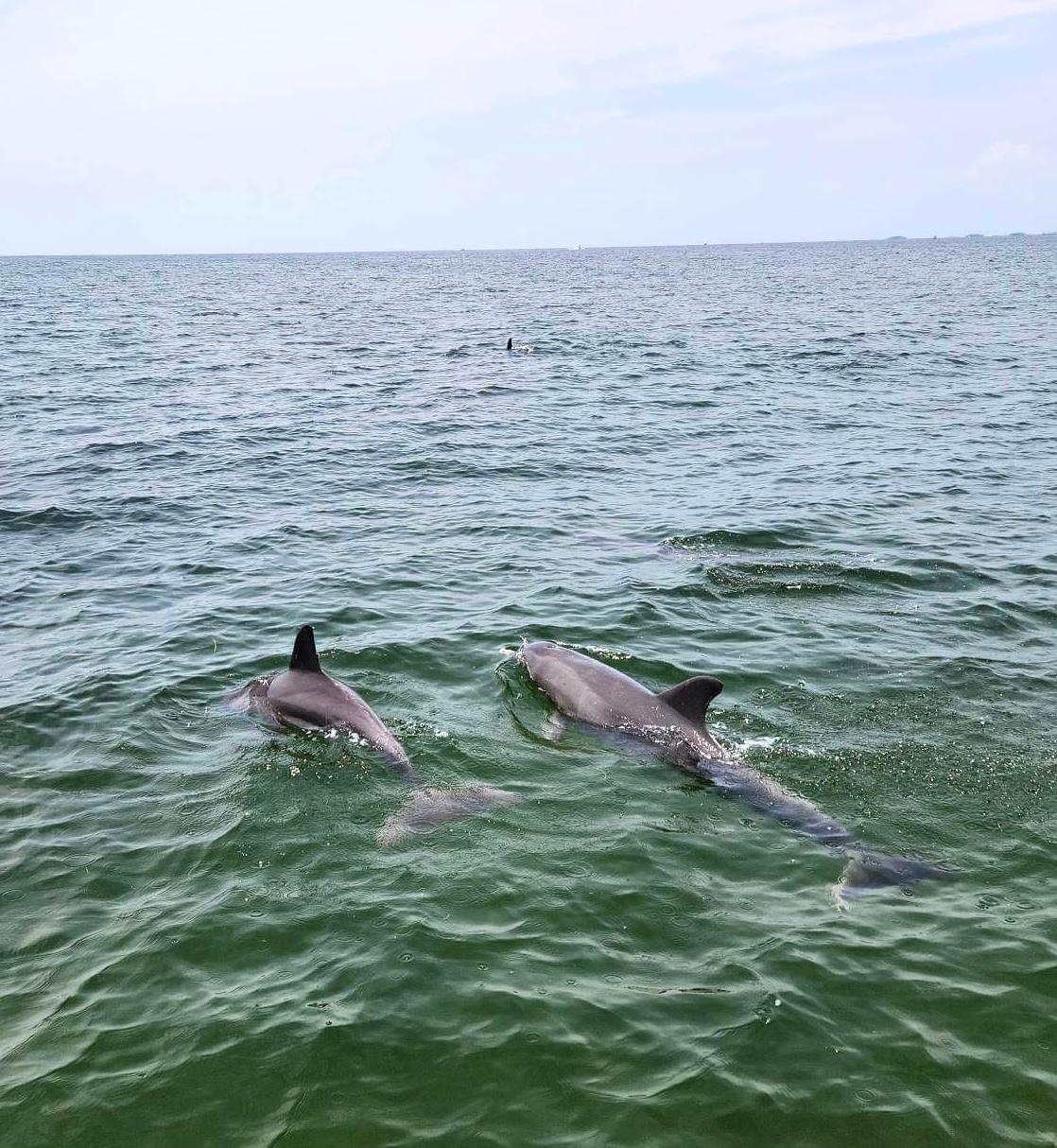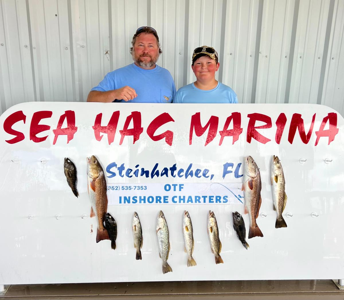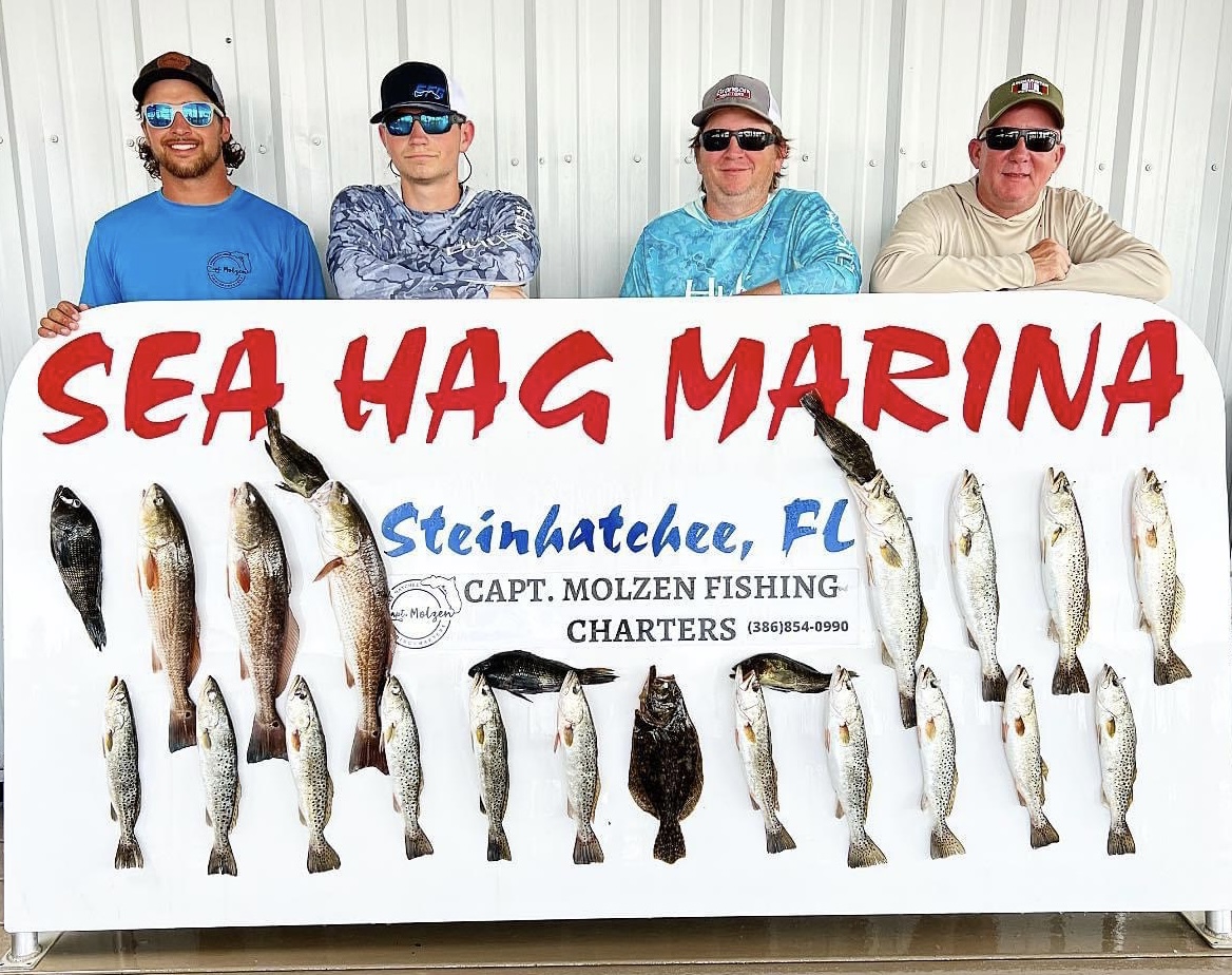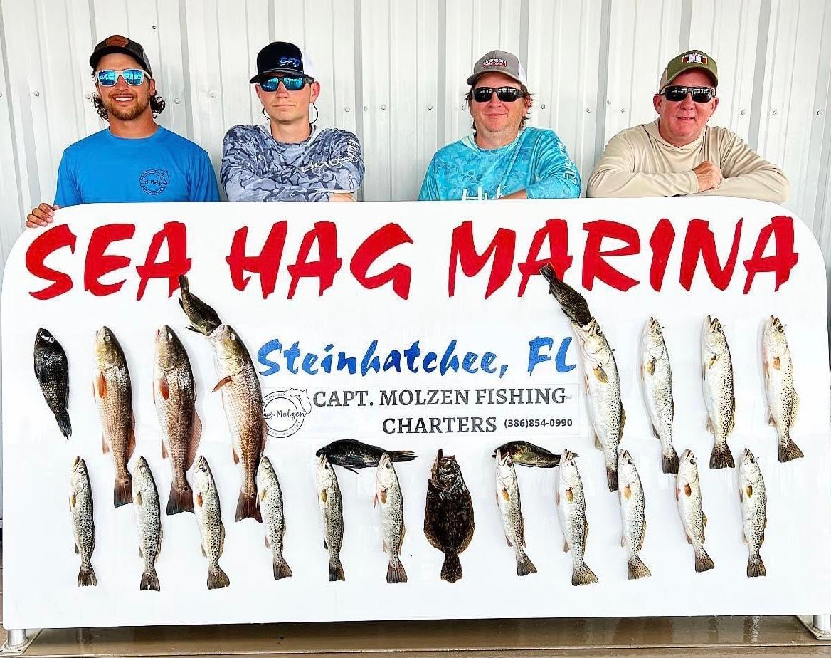 | Capt. Chase Norwood has been fishing with Mrs. Miriam since he was just a tiny thing! It's a treat of his to get to return the gesture and take Miriam fishing now! | Gail, Izzy & Sarah caught an inshore slam of redfish , trout & black drum with Capt. Randy Harris. | Brand NEW 450R Mercury Engines! In-box, not registered yet. Heck of a deal! Call 352-498-3008 and ask for Sam to purchase! | Kim Fatora caught her very first redfish the other day and it was a 32 inch overslot! | The Williams crew were greeting back a couple manatees during their fishing trip! | They also got to meet a group of dolphins as well! How cool | 2001 24' Voyage Pontoon Boat FOR SALE at Sea Hag Marina! Comes with trailer and newly installed GPS & Sound System! Asking for $13,000, call 352-498-3008 and ask for Amanda for more information! | |