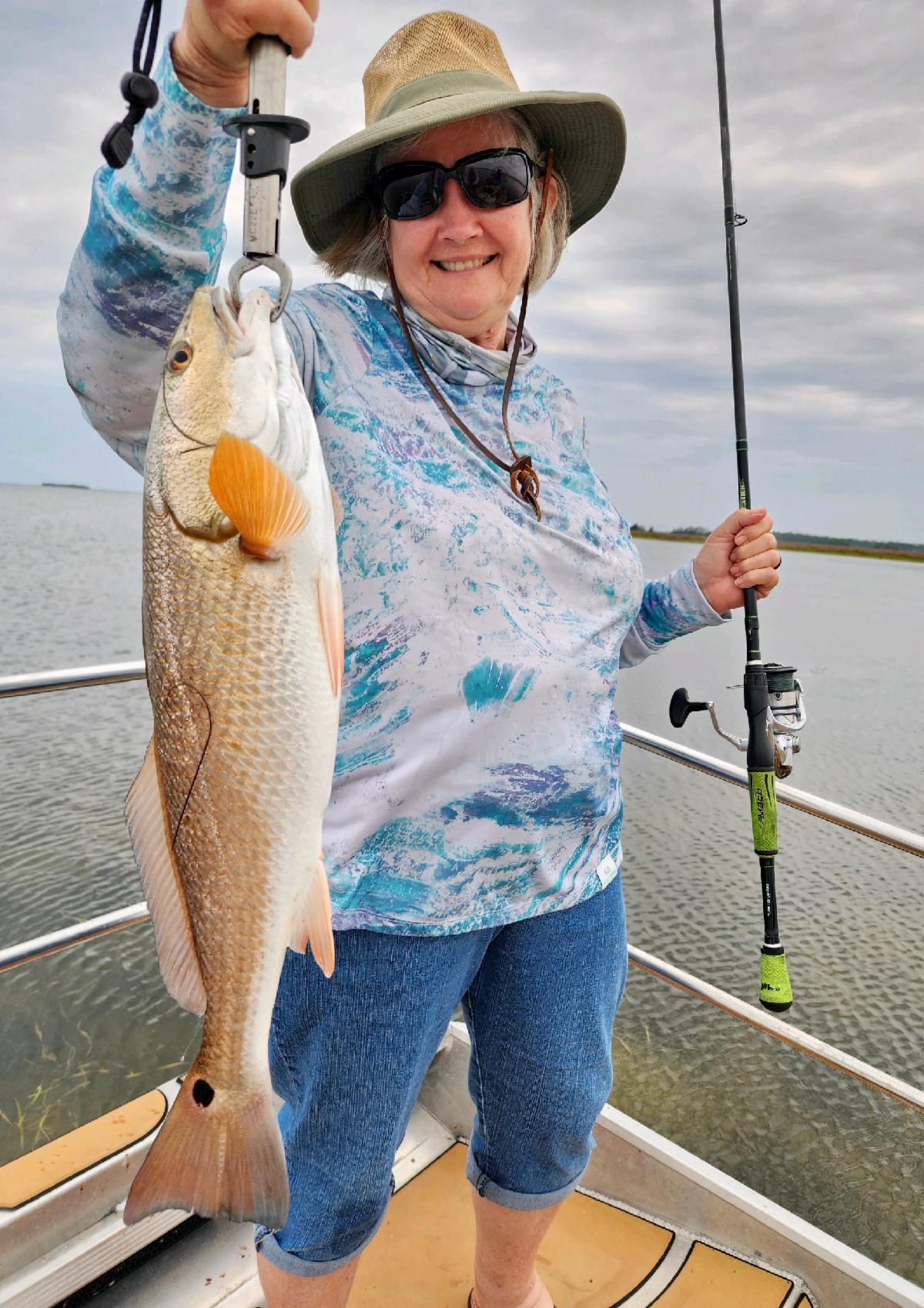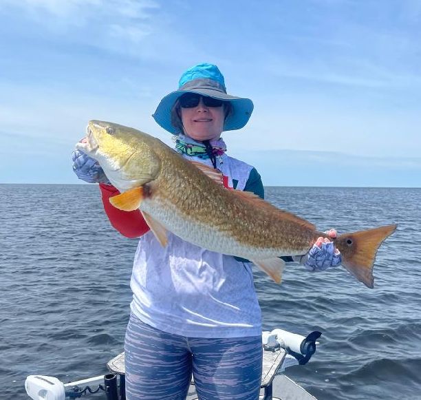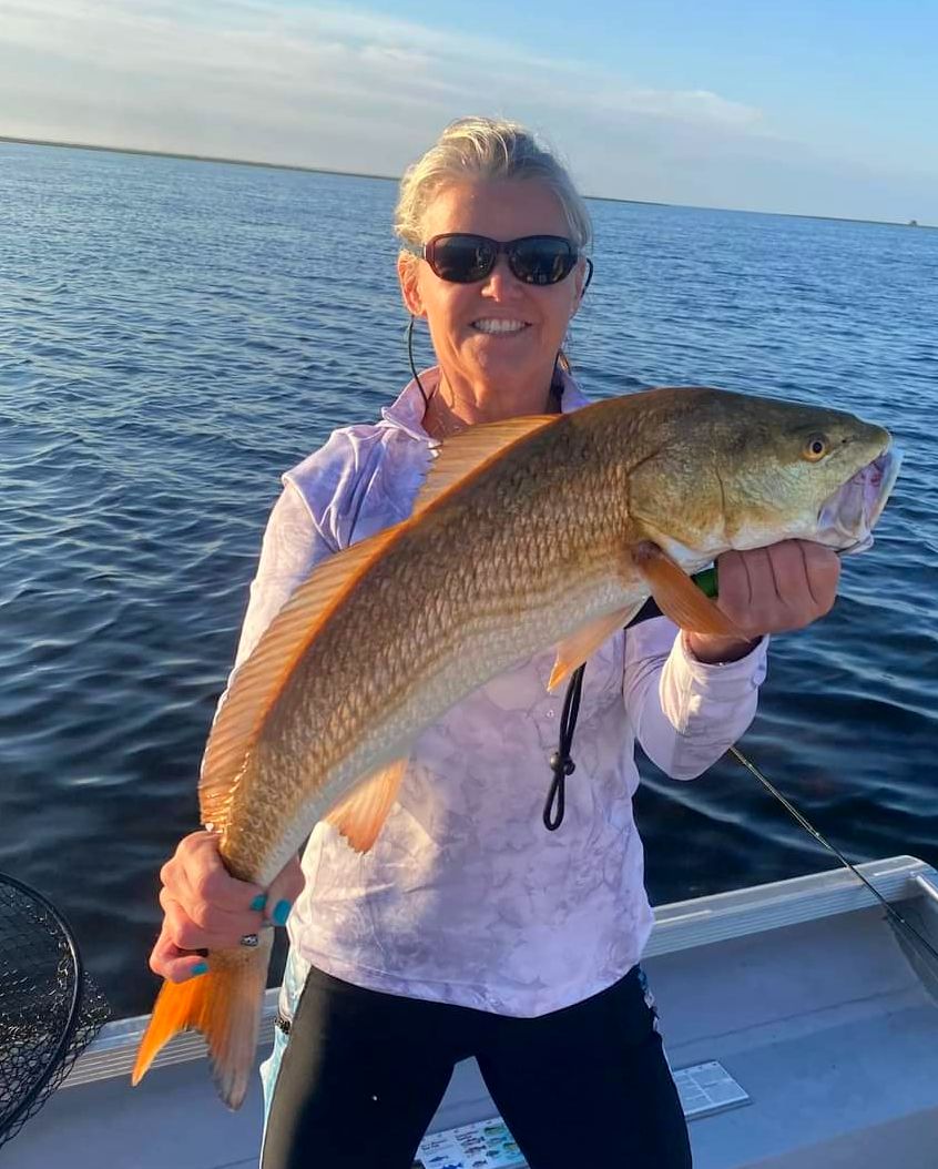 Gail is holding up a beautiful redfish she landed while fishing with Capt. Randy Harris.