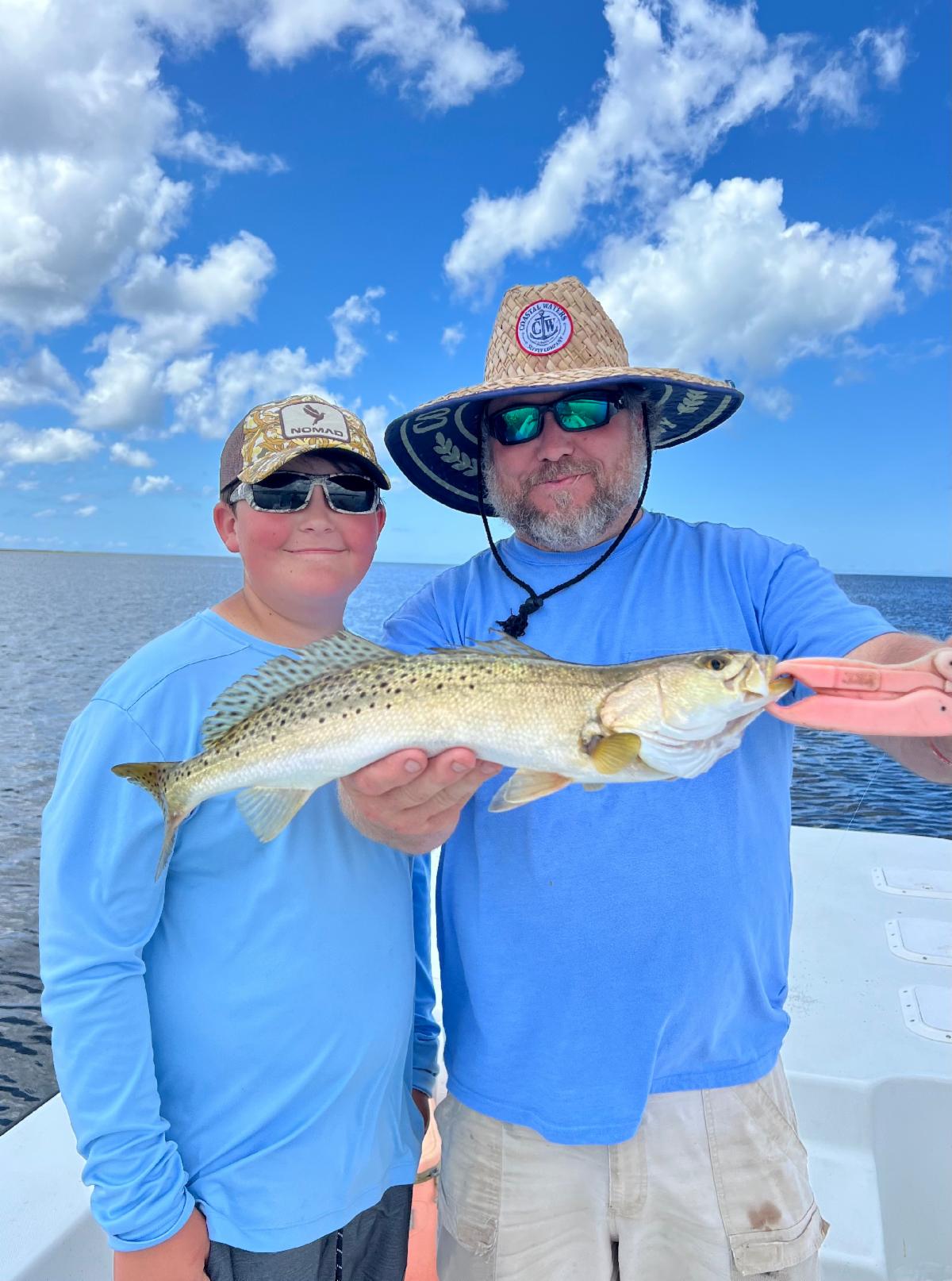 | Wayne & Gavin Stone are showing off a perfect 22 inch trout they caught while fishing with Capt. Chris Chico Graham. It was their personal best! | |