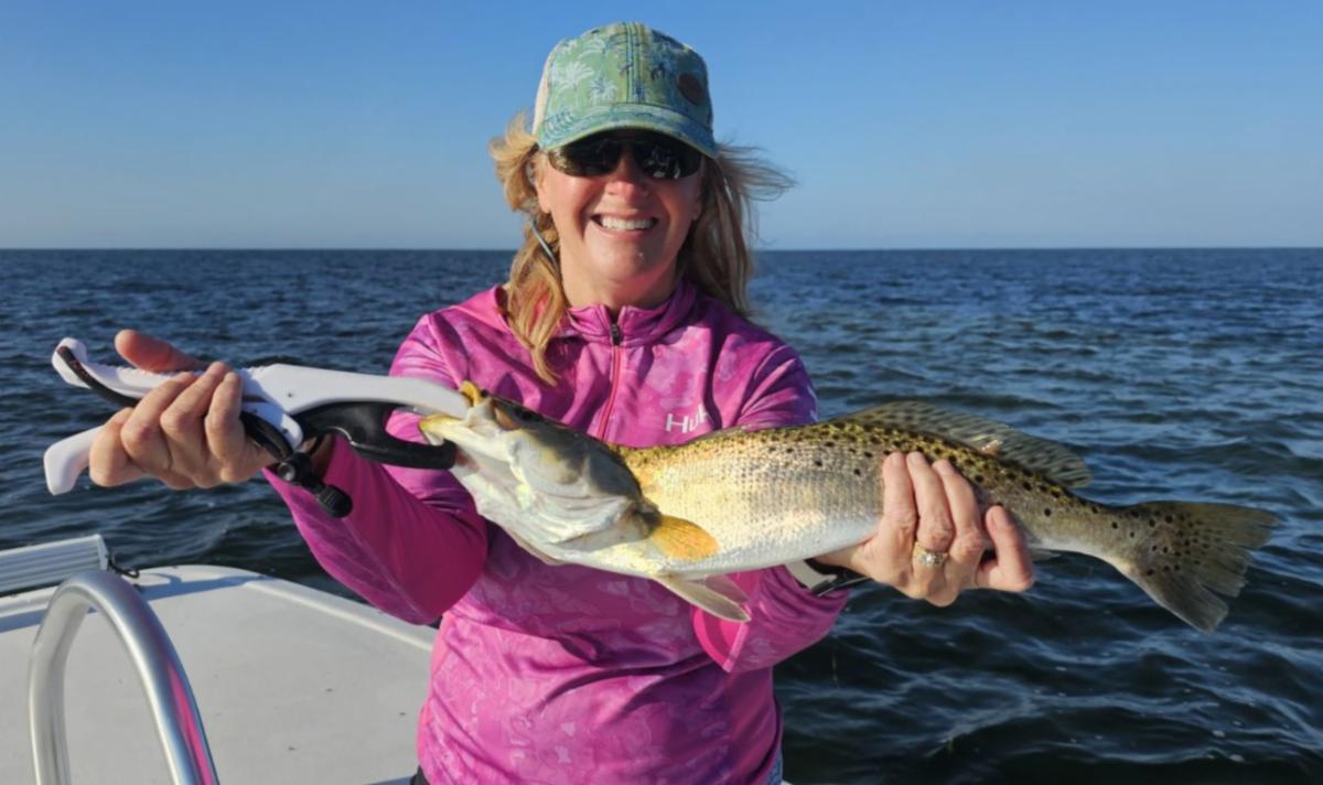 | Wayne & Gavin Stone along with Capt. Chris Chico Graham, tripled up on redfish. | Amie Martin from Port St. Joe, reeled in this nice trout with Capt. Kyle Skipper. | |