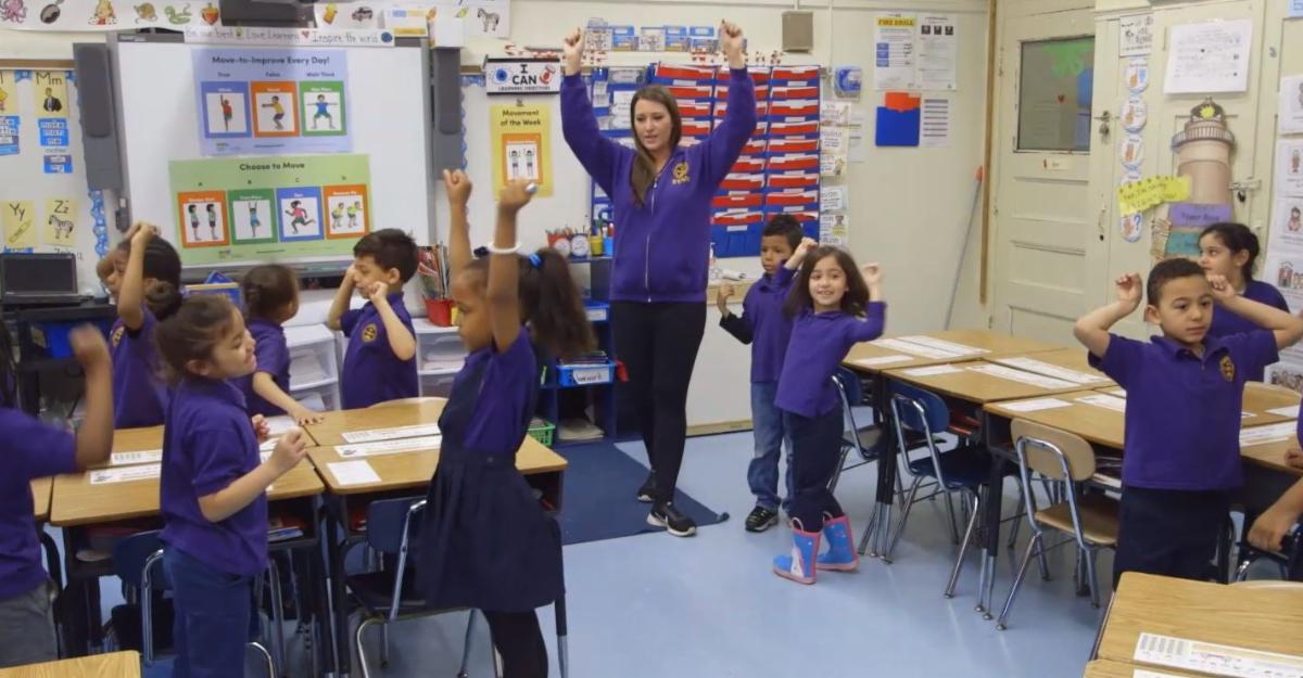 A kindergarten/first-grade class at PS 6 in the Bronx engages in a Move-to-Improve activity.. (Photo: Awakened Films)