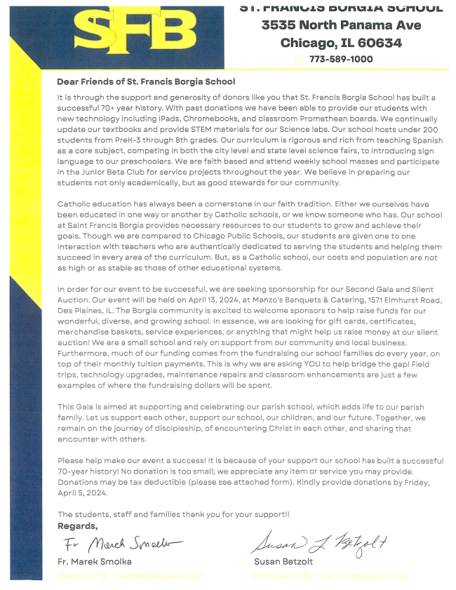 - Invitations have been sent out! Our Spring Gala will be held this year on Saturday, April 13th. The Gala will be held at Manzo’s Banquets & Catering, 1571 Elmhurst Road, Des Plaines, IL from 6:00-12:00. Tickets are $110 each or a table of 10 for $1000. Dinner, open bar and entertainment are included in the ticket price. All school children of families that attend the gala will have a free dress down pass for every Monday until the end of the school year. Purchase your tickets now. Please consider sponsoring or asking a business to sponsor us as we fundraise for our children’s school.
