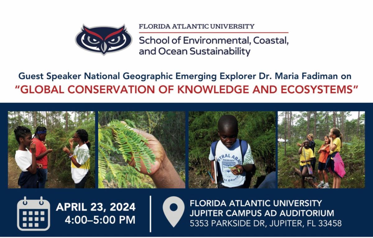 How do people connect with their ecosystems throughout the globe? FAU professor of geosciences, National Geographic Emerging Explorer, and TEDx speaker, Maria Fadiman, Ph.D., will explain in this upcoming public lecture. Focusing on how knowledge transfers between generations, Fadiman will explore the concept of ethnobotany, people and plants, looking at examples of what that means, and how that knowledge is transferred.