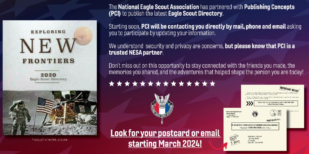 The National Eagle Scout Association is publishing the latest Eagle Scout Directory. Starting soon, PCI will be contacting all Eagle Scouts directly by mail, phone and email asking you to participate by updating your information.
