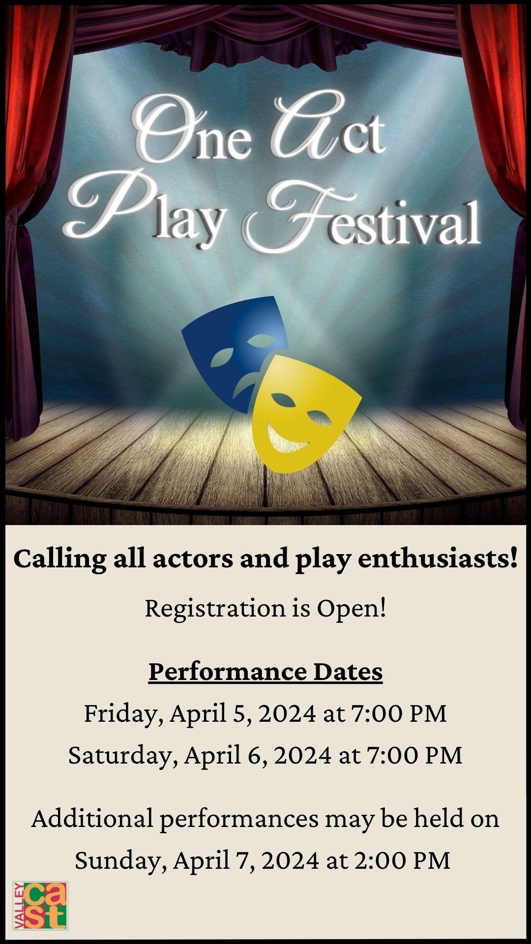 Whether you're a seasoned professional or someone setting foot on stage for the first time, the One Act Play Festival is the place for you to shine!