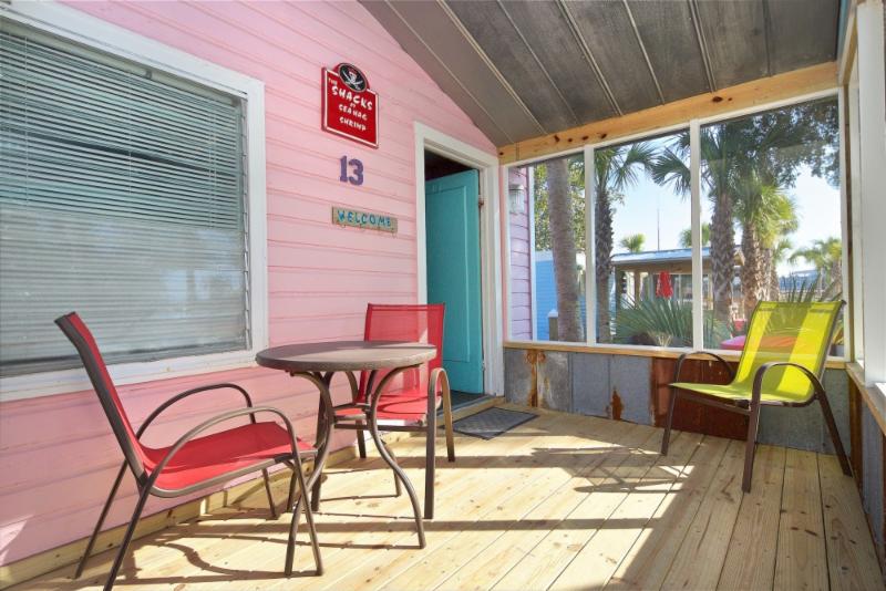 BELOW Our smallest unit is the little pink Shrimp. This tiny shack was built in 1937 and still has jalousie windows. It has a bedroom with two twin beds and a full bed in the main living area. The bathroom is tiny too (see picture below). Amenities includes a coffee maker. Sleeps 4.