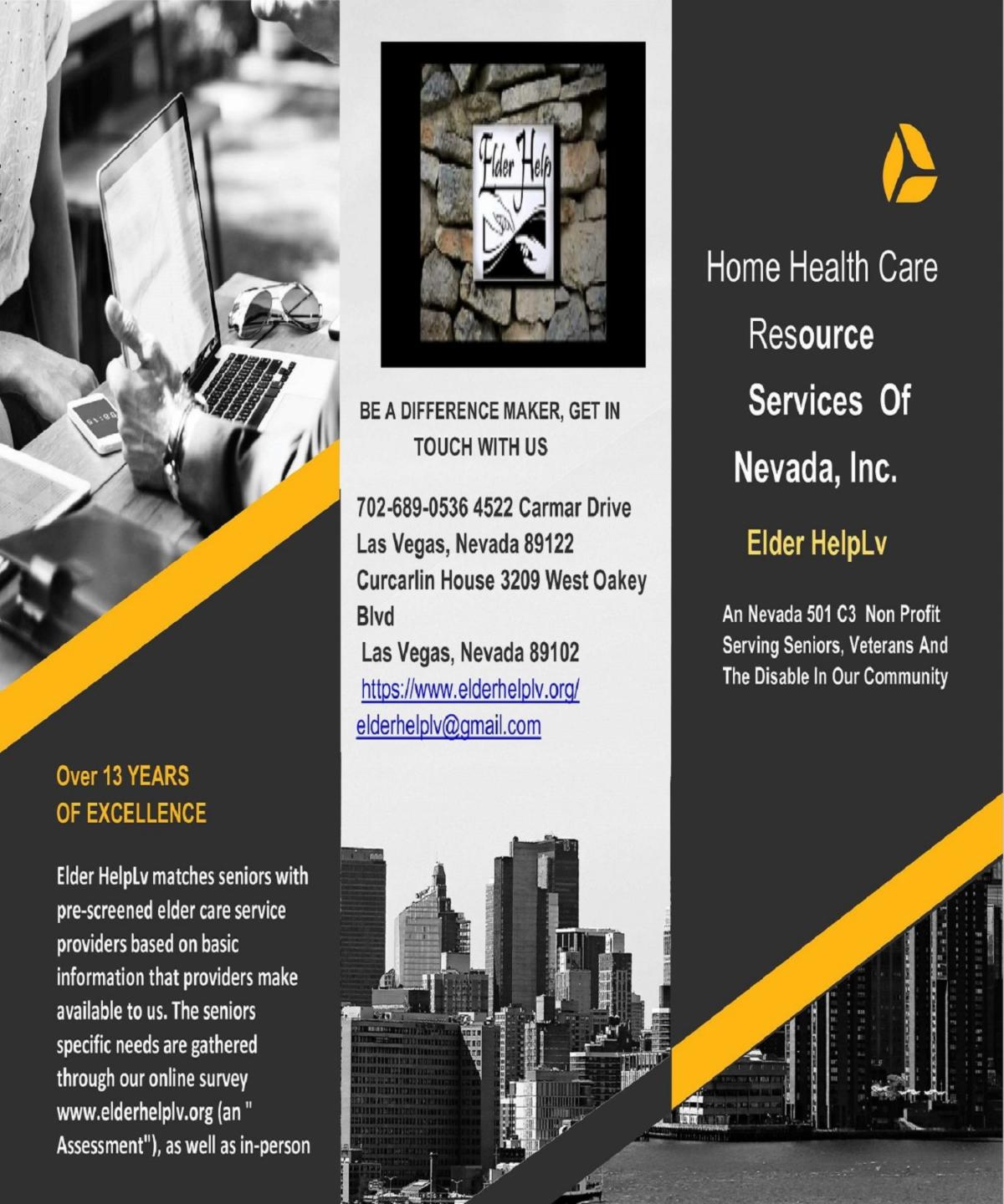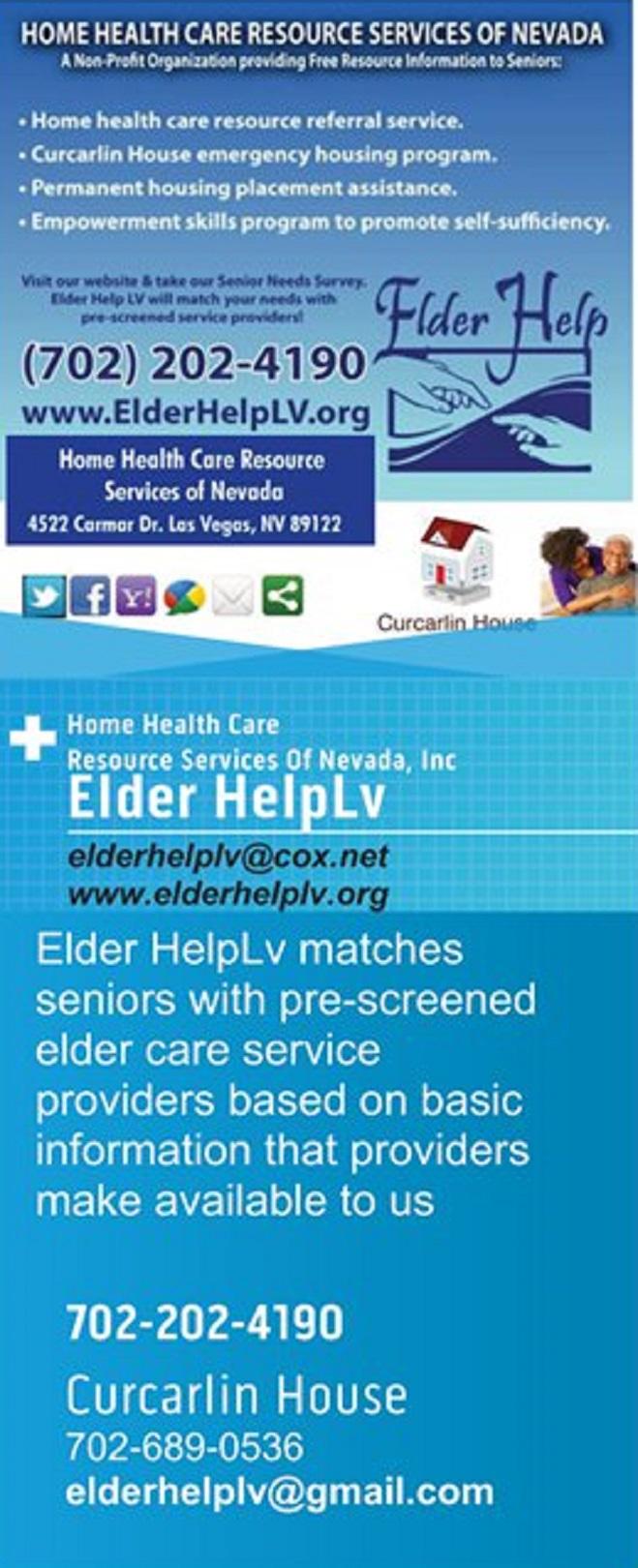 Elder Help maintains an extensive database of senior service providers throughout Clark County. Hundreds of seniors use the Elder Help website to receive provider information every day.Health Care Resource Services of Nevada Is a Non-Profit Organization that seeks to encompass all senior citizens of the Las