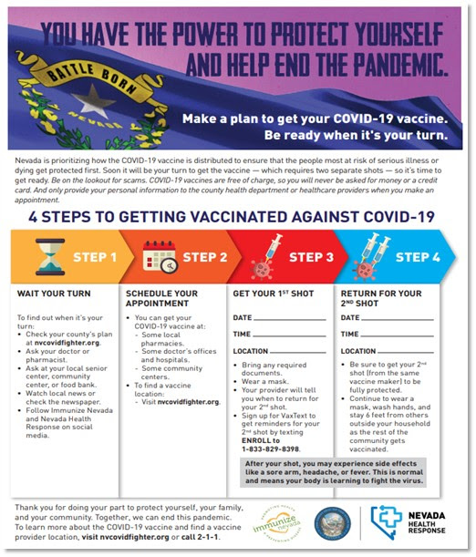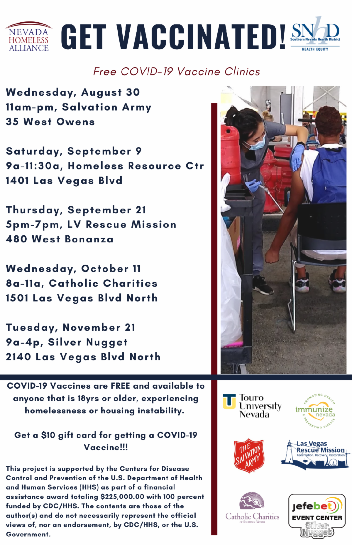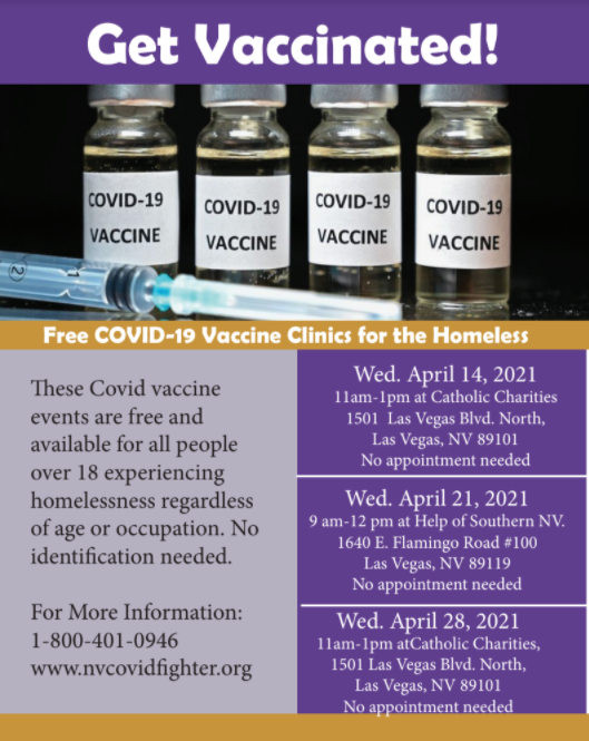 The COVID-19 Vaccine is available to all people experiencing homelessness, age 18 and older! Vaccine Clinics are being hosted on a weekly basis for the next few months to ensure that our homeless community members have access to the COVID-19 Vaccine. Getting vaccinated is the best protection from getting sick, becoming severely ill, and protecting your community living in close quarters .Next Up: April 14th at Catholic Charities (1501 Las Vegas Blvd . North Las Vegas, NV 89101) 11am-1pm.
