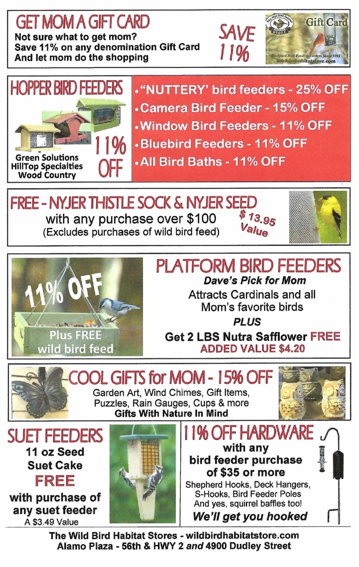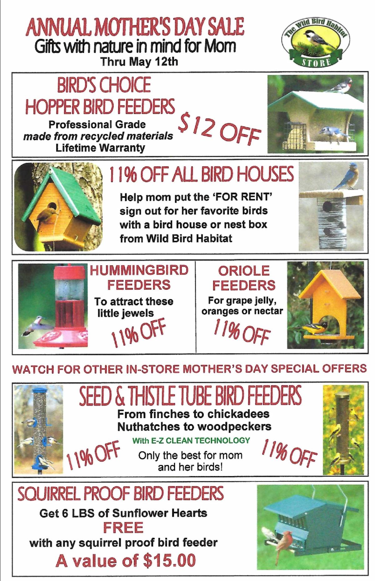 10% OFF bird feeders, birding supplies, wild bird feeds
