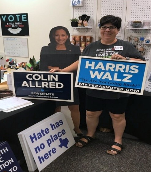 The signs are printed on both sides so that we can support both Harris/Walz and Colin Allred at the same time and for one price of $20 per sign. Each sign will come with its own stake to designed to fit this style of sign.