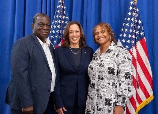 According to Eartha Johnson (pictured above left with her husband Lonnie, and above right in a keepsake shot with Vice President and Democratic Presidential Nominee Harris), just being in the hall was electrifying. At one point they were seated just behind Gov. Walz and his family and at another point they even got to greet our next President, up close and personal. Eartha said she felt as if a great weight of darkness was lifted from her spirit. It’s a feeling she said she will remember for the rest of her life.