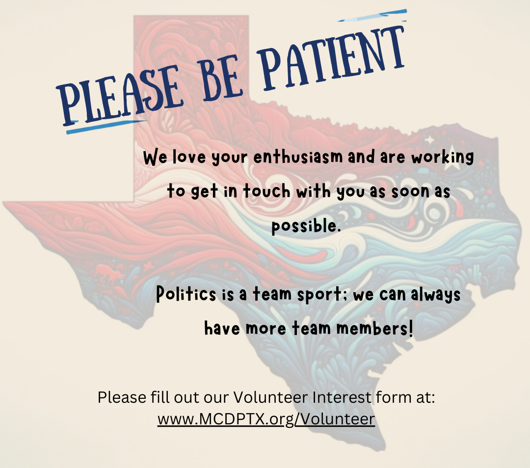 To participate email campaignsupport@mcdptx.org to receive information about this postcard writing project and pick up locations. We provide tips and scripts so all you have to do is write the message, address the card, and add a stamp. Please note that we ask anyone writing postcards to purchase stamps for the cards they write. The campaigns do not have the funds to purchase stamps for this project.