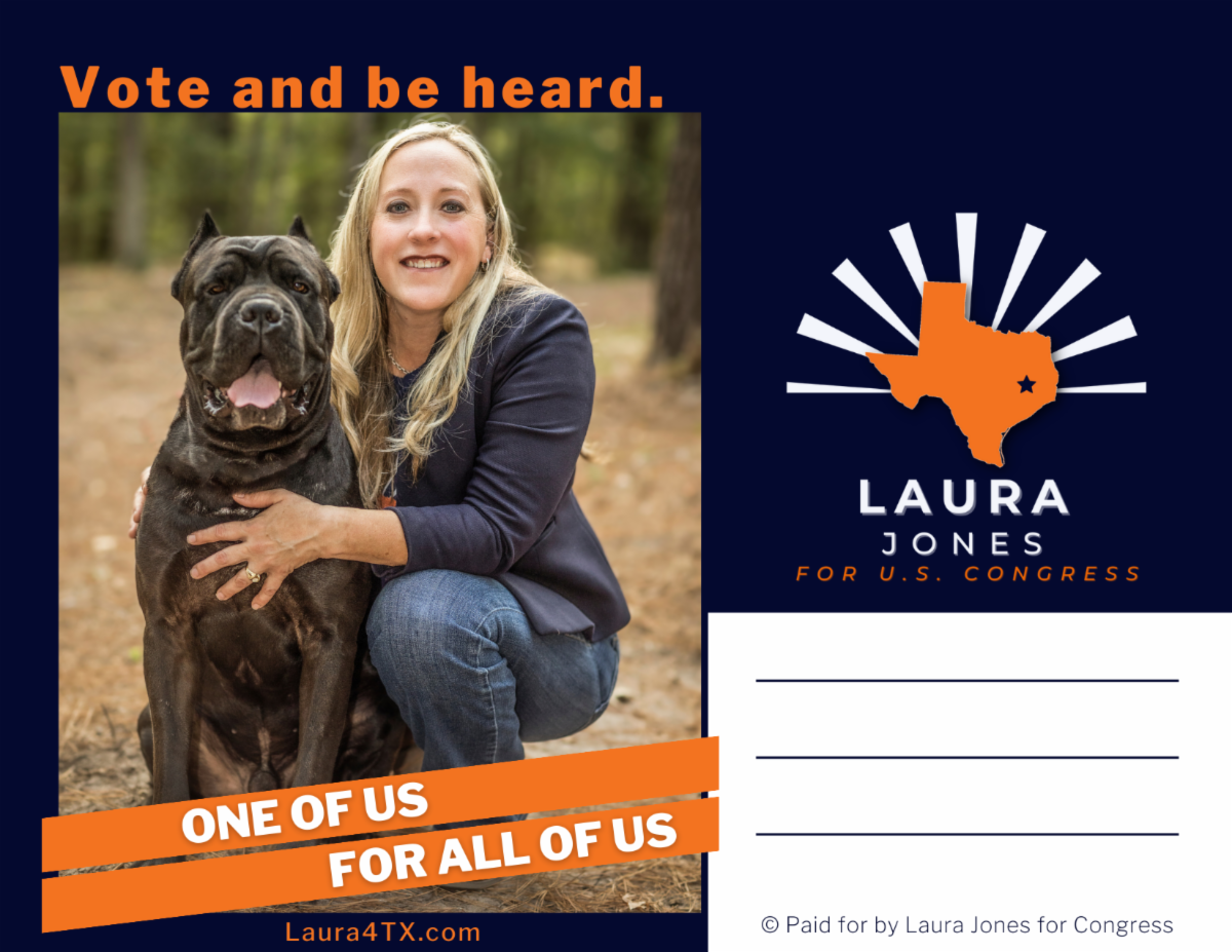As you may have heard there are two postcard writing projects for two local candidates. Laura Jones is candidate for US Congress District 8 and Mike Midler is candidate for Texas House District 18. The goal of these projects is to have personalized, handwritten postcards hit registered voters' mailboxes before early voting starts on October 21st. Name recognition matters in elections and we want voters to know that there are people in Montgomery County that feel strongly enough about the quality of these candidates and their values to take the time to write personal postcards. That gets attention and will make a difference in voter turnout.