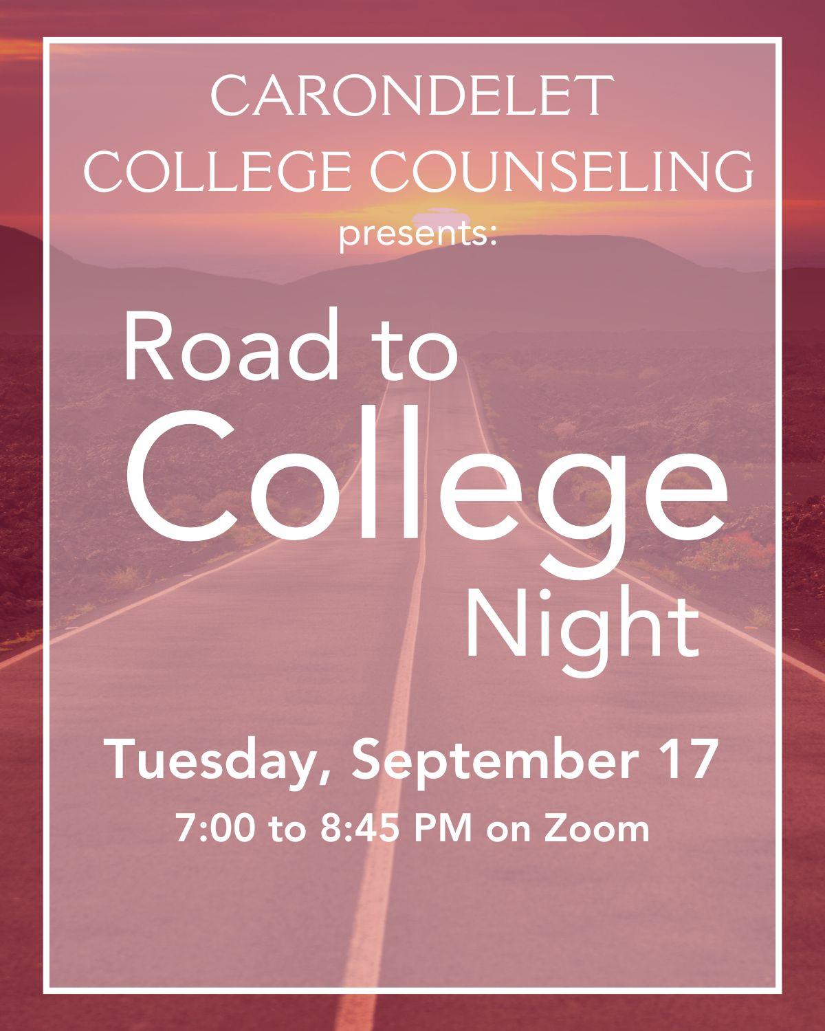 College Counseling is pleased to invite all Carondelet students and families to our annual Road to College Night on Tuesday, September 17, at 7:00 PM via Zoom. Representatives from a variety of colleges including UC Irvine, the University of Chicago, the University of Oregon, and the College of Charleston will be offering informative college-related workshops for families.