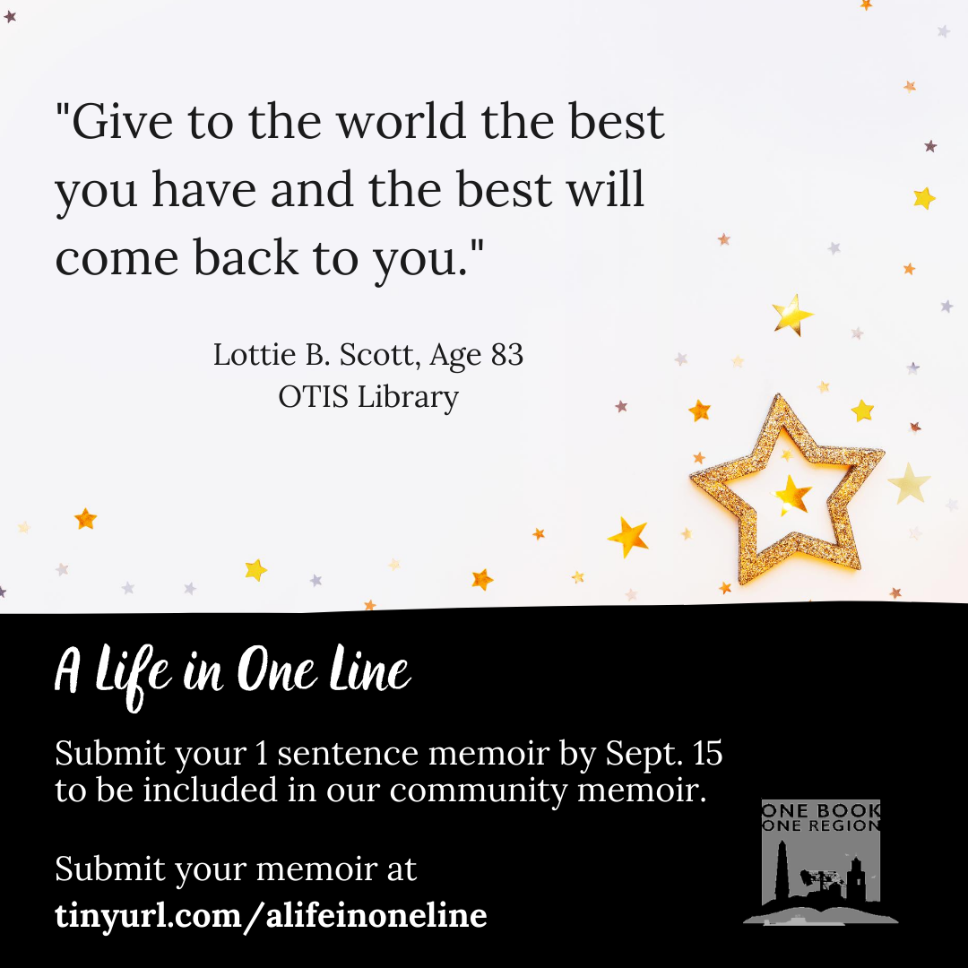 One Book One Region invites you to participate in our community memoir project, "A Life in One Line." Residents of New London County are invited to submit a one-sentence memoir to be compiled in a self-published book entitled "A Life in One Line." Use this link to submit your one sentence memoir. Please submit your line by September 15.