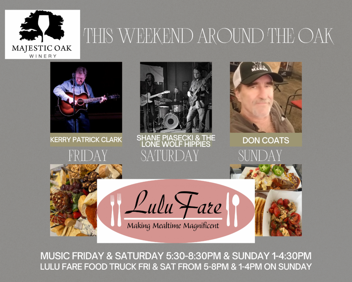 So many events with grape harvest, wine festivals, fundraisers, farmers' market & our live music schedule. It's hard to list them all, so always check the Calendar of Events for what's next at Majestic Oak.