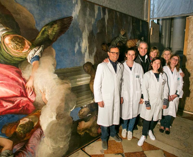 Conservators with Jeremy Irons in San Sebastiano Photo: Matteo De Fina