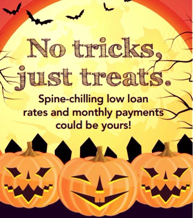 We will be having a new special starting mid-October. Qualified members will receive a scratch-off postcard in the mail revealing a spine-chilling rate reduction offer that can be used towards a new loan. Rates will vary. To redeem, bring the postcard into the office and get set up for your new special rate! See card for full details.
