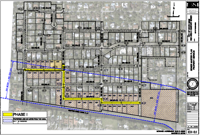 As you are aware, the City is currently working on transitioning from septic to sewer in your area (Marked by Phase 1 in yellow above). The plans for the project are currently under review by Miami-Dade County Water and Sewer Department, Fire Department, and Health Department. The City anticipates approval of the plans by Miami-Dade County in July 2024, which will allow for the project to be underway in August 2024. The construction timeline is approximately 270 days.