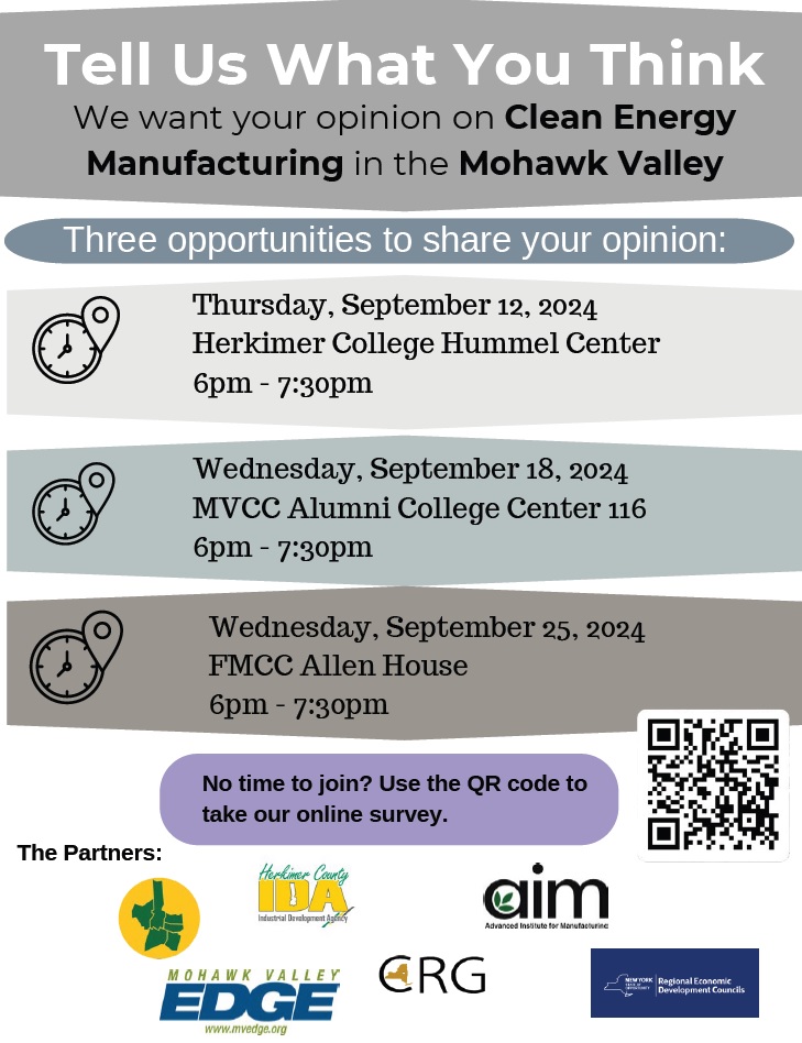 While it is not in Downtown Gloversville, our friends at Mohawk Valley Economic Development District (MVEDD) want to hear from you regarding clean energy manufacturing in the Mohawk Valley (which includes Gloversville) on Sept. 25 from 6 p.m. to 7:30 p.m. at FMCC’s Allen House, 2805 County Highway 67, Johnstown. “Make It Mohawk Valley” is a six-organization collaboration promoting economic development throughout the region and they are creating a roadmap to help bring clean energy manufacturing to the region.