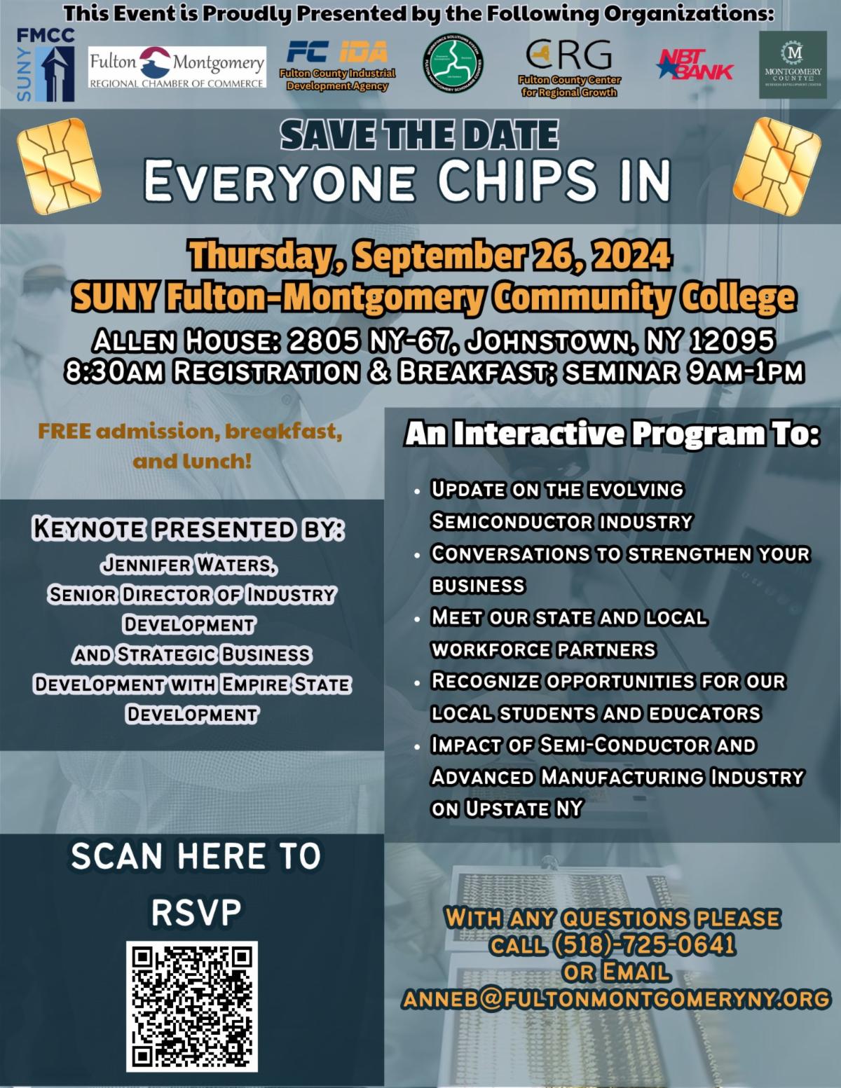 Also, at FMCC that would be of interest to Downtown Gloversville businesses, on Sept 26, is the “Everyone CHIPS In” event from 9 a.m. to 1 p.m. This is an interactive program to receive an update on the semiconductor industry, meet state and local workforce partners, and have conversations to strengthen businesses. For information and reservations, call Anne at the Fulton-Montgomery Regional Chamber of Commerce at (518) 725-0641.