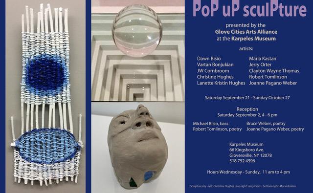 The Karpeles Museum, located at 66 Kingsboro Ave., will host the “Pop Up Sculpture Show” exhibit from Sept. 21 through Oct. 27. The opening will be held on Sept. 21 from 4 p.m. to 6 p.m. Presented by Glove Cities Arts Alliance and Karpeles Museum, the featured artists in the show are Dawn Bisio, Vartan Bonjukian, JW Cornbroom, Christine Hughes, Lanette Kristin Hughes, Maria Kastan, Jerry Orter, Clayton Wayne Thomas, Robert Tomlinson, and Joanne Pagano Weber. Museum Hours are Wednesdays through Sundays from 11 a.m. to 4 p.m.