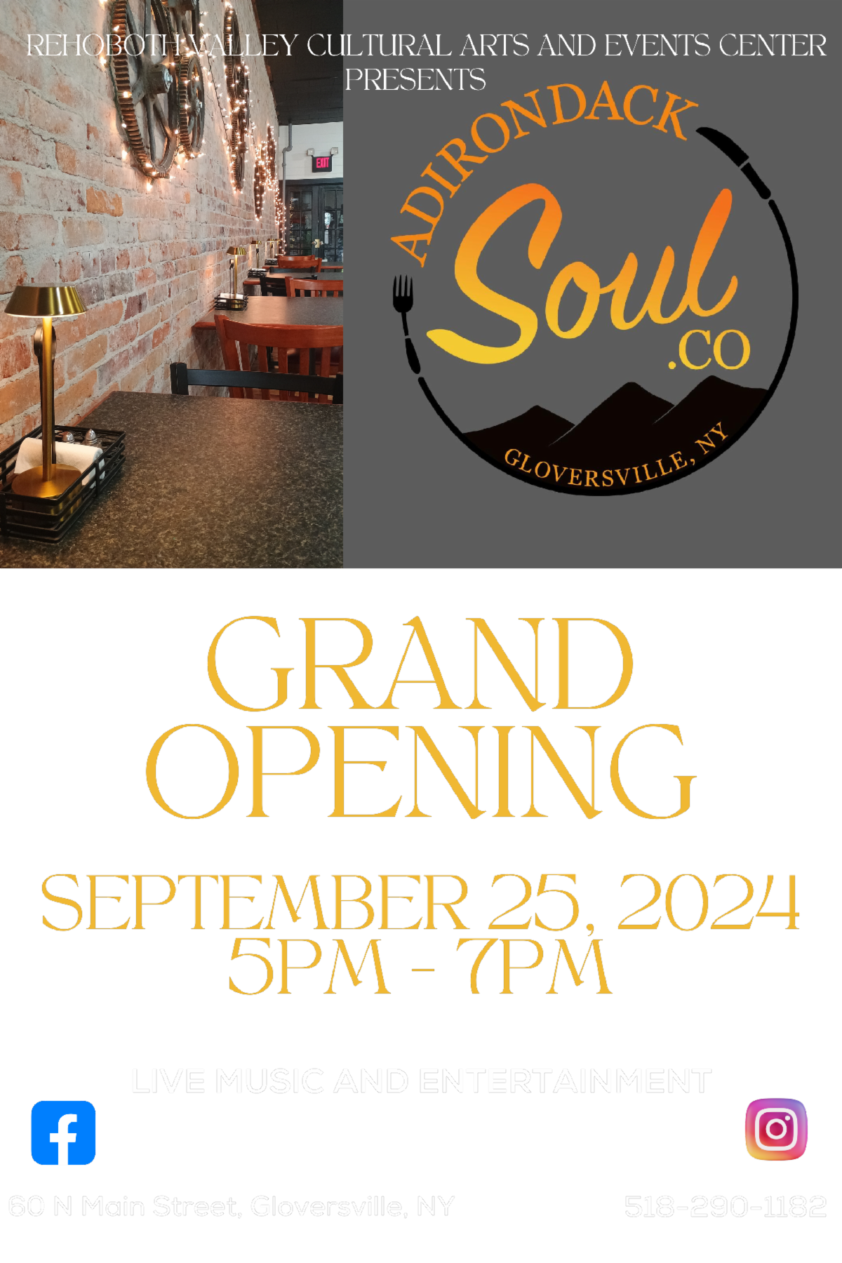 Adirondack Soul Company, located at 60 N. Main St., has been having a soft opening for the last few weeks but on Wednesday, Sept. 25, it will hold its official grand opening celebration from 5 p.m. to 7 p.m. The full menu can be found on its Facebook page.
