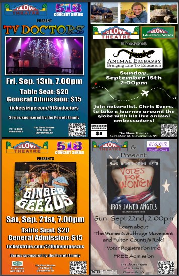 The Glove Theatre, 42 N. Main St., will host the instrumental trio known as “TV Doctors" tonight, Friday, Sept. 13, from 7 p.m. to 9:30 p.m. For tickets, visit ticketstripe.com/518tvdoctors. For a list of eating options before the show, visit www.downtowngloversville.org/restaurants-eateries. Later this weekend, on Sunday, Sept. 15, The Glove Theatre will host “Animal Embassy: Bringing Life to Education” at 2 p.m. Chris Evers of Animal Embassy will have live animals from diverse habitats at the event. There is a $5 suggested donation.