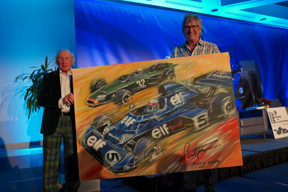 The stage banner, displayed behind Stewart and Rahal. and the canvas prints of Stewart's Tyrrell F1 car were created by Paul Laguette, whose mother-in-law suffers from dementia. This, and his love of the sport, inspired Laguette to produce these pieces.