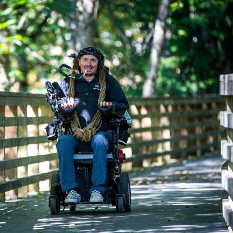 Ian Mackay is a remarkable man. His life took a dramatic turn 15 years ago when he was in a devastating bike accident leaving him paralyzed from the neck down. As a quadriplegic, he felt his life had stopped short at the young age of 26. But with loving support from his family and friends, he began the journey to accepting that he was paralyzed. Four years after his injury, he rekindled his passion for being outdoors, riding his wheelchair on the Olympic Discovery Trail. He’d found his happy place.