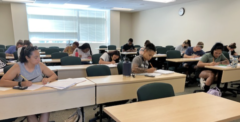Photos: Above Left: Professor Kielwasser’s Cinema CINA 010 Course watching media during a presentation. Above Right: Professor Jones’ Political Science PLSC 001 Course engaged during lecture. Below: Professor St.Germain’s Chemistry 160 course. SCC Students concentrating while taking an Exam. | |