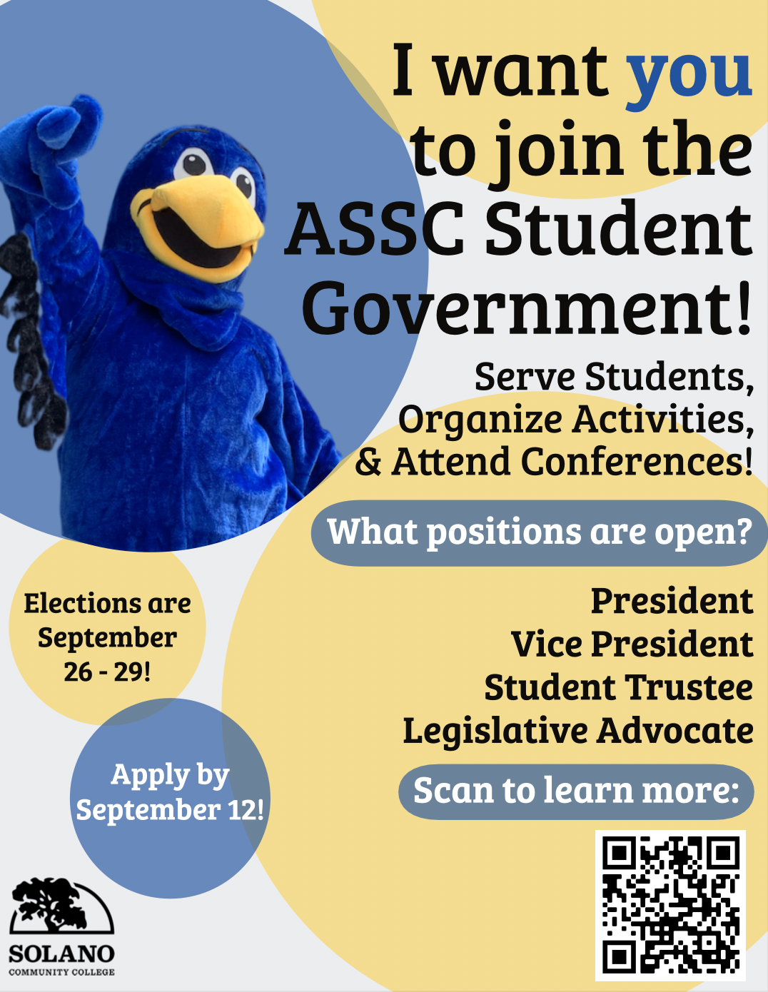 We want to encourage you to join the ASSC Senate or Student Government. All positions are open. Applications are due September 12 and elections will be held September 26-29. | |