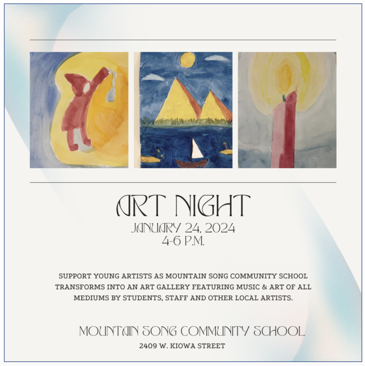 Mark your calendars! We are opening our doors for Art Night on Wednesday, January 24th from 4-6 p.m. to showcase the amazing talents of 1st-8th students, staff, and other local artists. We are featuring visual art of all medium and musical performances. Please invite friends, neighbors, grandparents, and anyone who may be interested in learning more about our wonderful Mountain Song community!