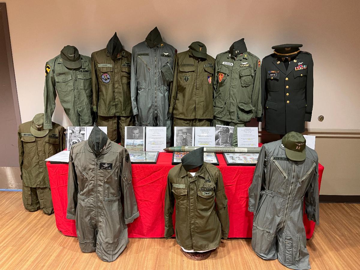 There are over 60 represented in this display. The oldest uniform was from a LT General who as a young Lieutenant fought in the Spanish American War. There is an admiral who had become a Navy Double-Ace in World War II as fighter pilot on both the USS Lexington and USS Enterprise. There is a uniform from one of the commanding generals of the 1st Infantry Division in Vietnam and other commanders during that time. Modern day generals are well represented including the digitals of General David Petraeus, commander of all coalition forces in Iraq/Afghanistan. There are helmets, wings and other artifacts in addition to the uniforms in this snapshot of military leaders of multiple generations.