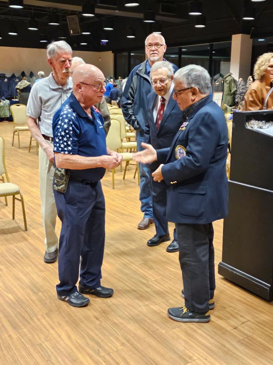 A few of the many veterans in attendance receiving their commemorative veterans pin from MG Albert Zapanta, Army retired. | |