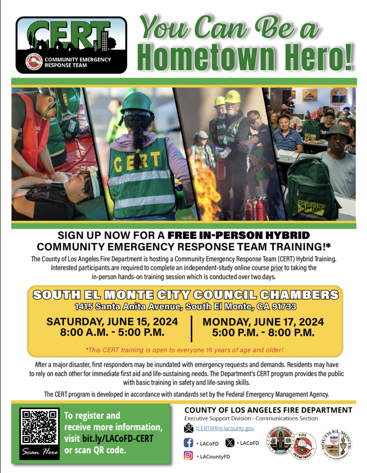 The LACoFD has an upcoming FREE, Hybrid Community Emergency Response Team class in South El Monte beginning Saturday, June 15, 2024!