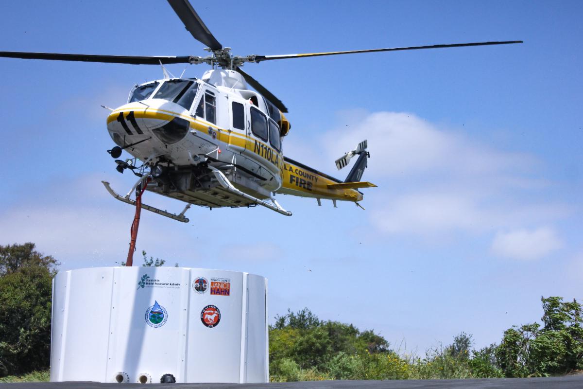 An LA County Bell 412SP helicopter practiced siphoning water from an 8,000-gallon refillable Heli-hydrant located in La Habra Heights and dropping the water on designated sites nearby. Firefighters conducted their drills climbing up a steep hill on Lupin Hill Road.