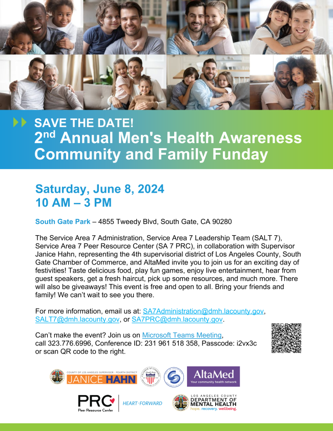 Men's Community Family Fun event will be on Saturday, June 8th at South Gate Park. This event provides a great opportunity for families and friends who are seeking resources or just a time out with exciting festivities.
